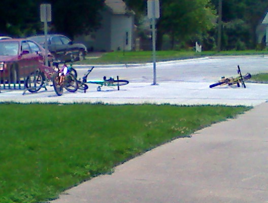 Even in the small town I lived in as a child we wouldn't have gotten away with this - let alone anywhere now in the 2000's. Gotta love the small town (that and I was so distracted by the unlocked bikes that I left my car doors unlocked with my purse sitting on the front seat for anyone's taking while I took this picture and then went into the pool for about 10 minutes to collect kids) :P